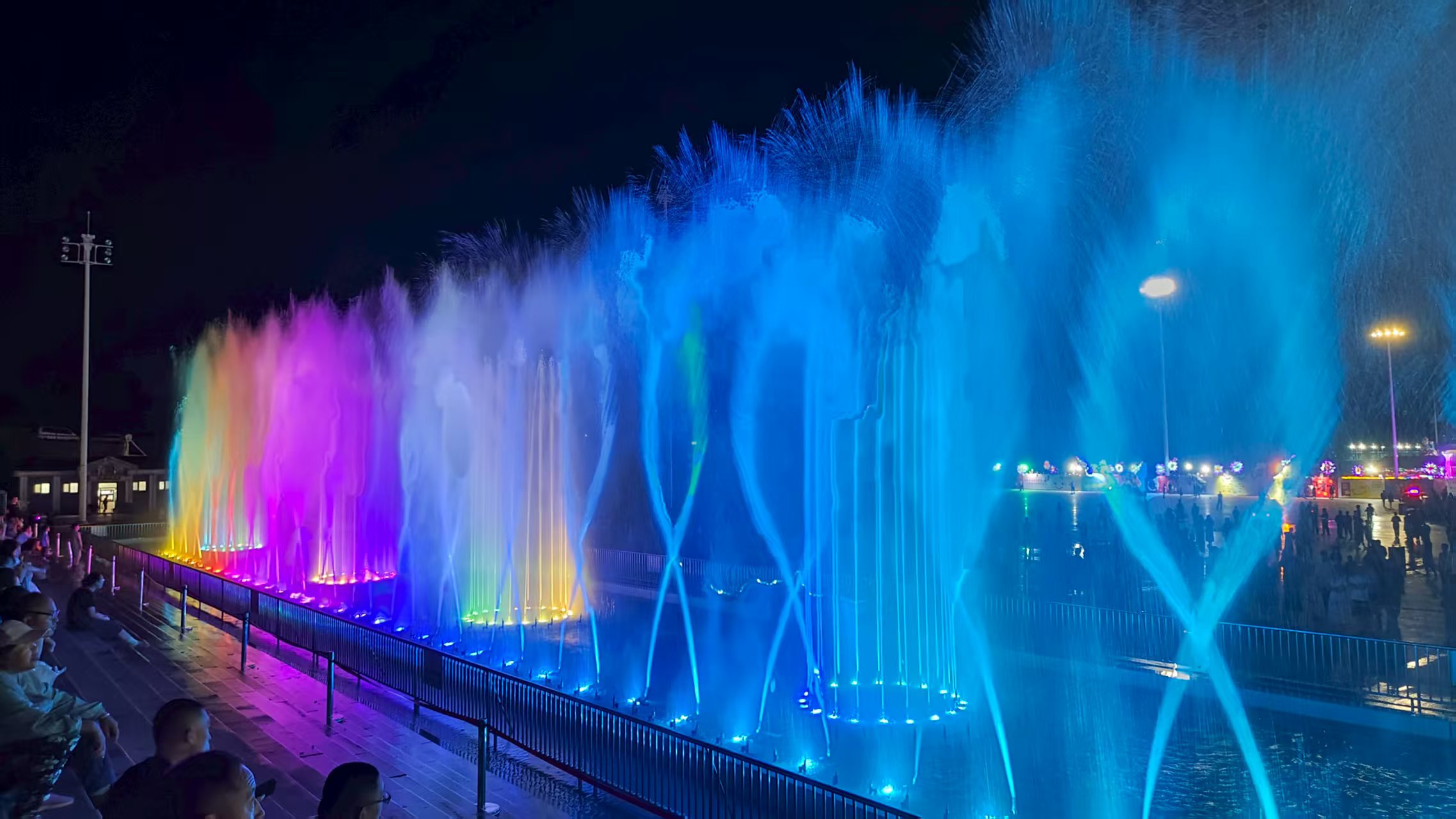 六點(diǎn),640平方米的噴泉池已經(jīng)圍起了半圈人。穿背心的大爺搖著蒲扇數(shù)池邊的噴頭,穿校服的少年舉著手機(jī)調(diào)試角度,賣熒光棒的小販穿梭在人群里,塑料棒碰撞的脆響像串起的省略號。池底的燈帶突然暗了下去,人群霎時安靜,只有晚風(fēng)卷著遠(yuǎn)處旋轉(zhuǎn)木馬的音樂飄過來。