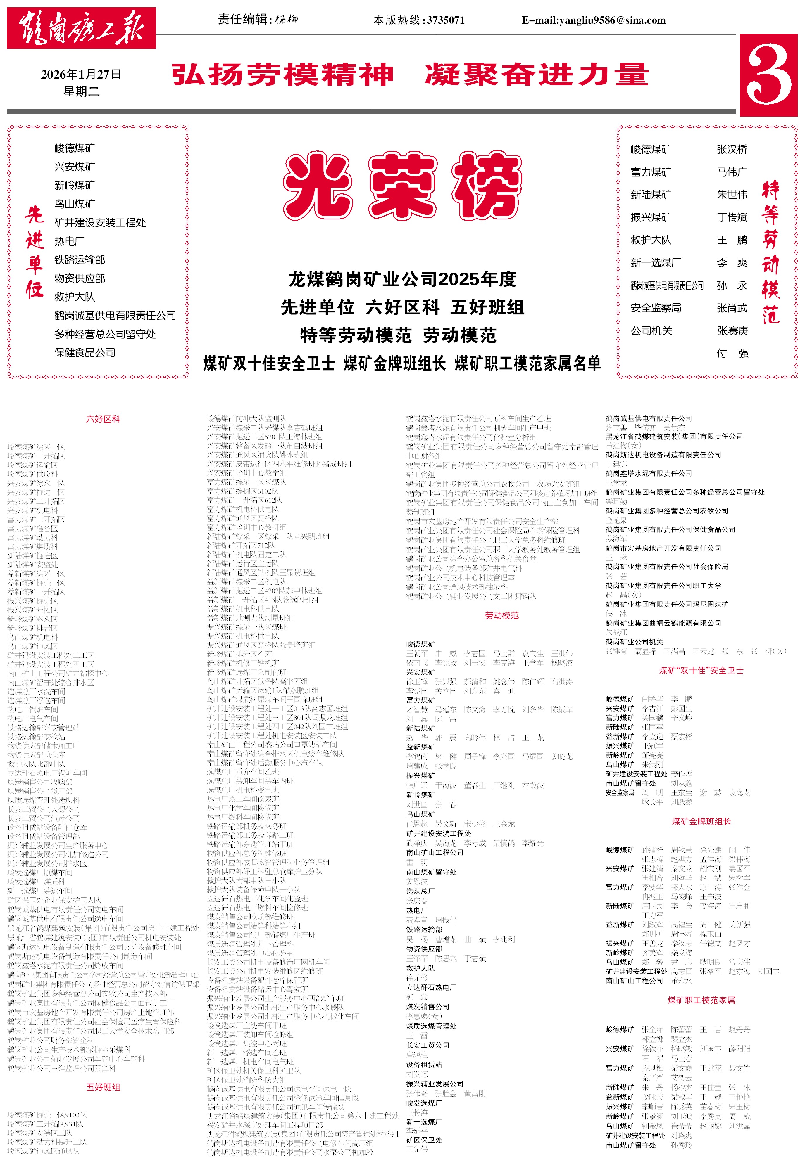 授予:峻德煤礦綜采一區(qū)、興安煤礦掘進一區(qū)、益新煤礦一開拓區(qū)、新嶺煤礦露采區(qū)、鳥山煤礦通風區(qū)、鐵路運輸部興安管理站等69個區(qū)科“六好區(qū)科”榮譽稱號。