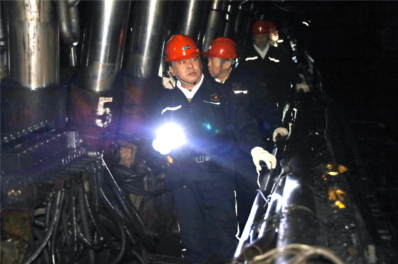 在綜采三隊(duì)工作面回風(fēng)道,張忠波對照工程技術(shù)牌板,詳細(xì)詢問工作面剩余走向長度、地質(zhì)構(gòu)造變化、區(qū)域?yàn)?zāi)害治理進(jìn)展及防災(zāi)治災(zāi)措施落實(shí)等情況,檢查了工作面安全標(biāo)準(zhǔn)化動態(tài)達(dá)標(biāo)建設(shè)成效和煤層賦存實(shí)際狀態(tài)。